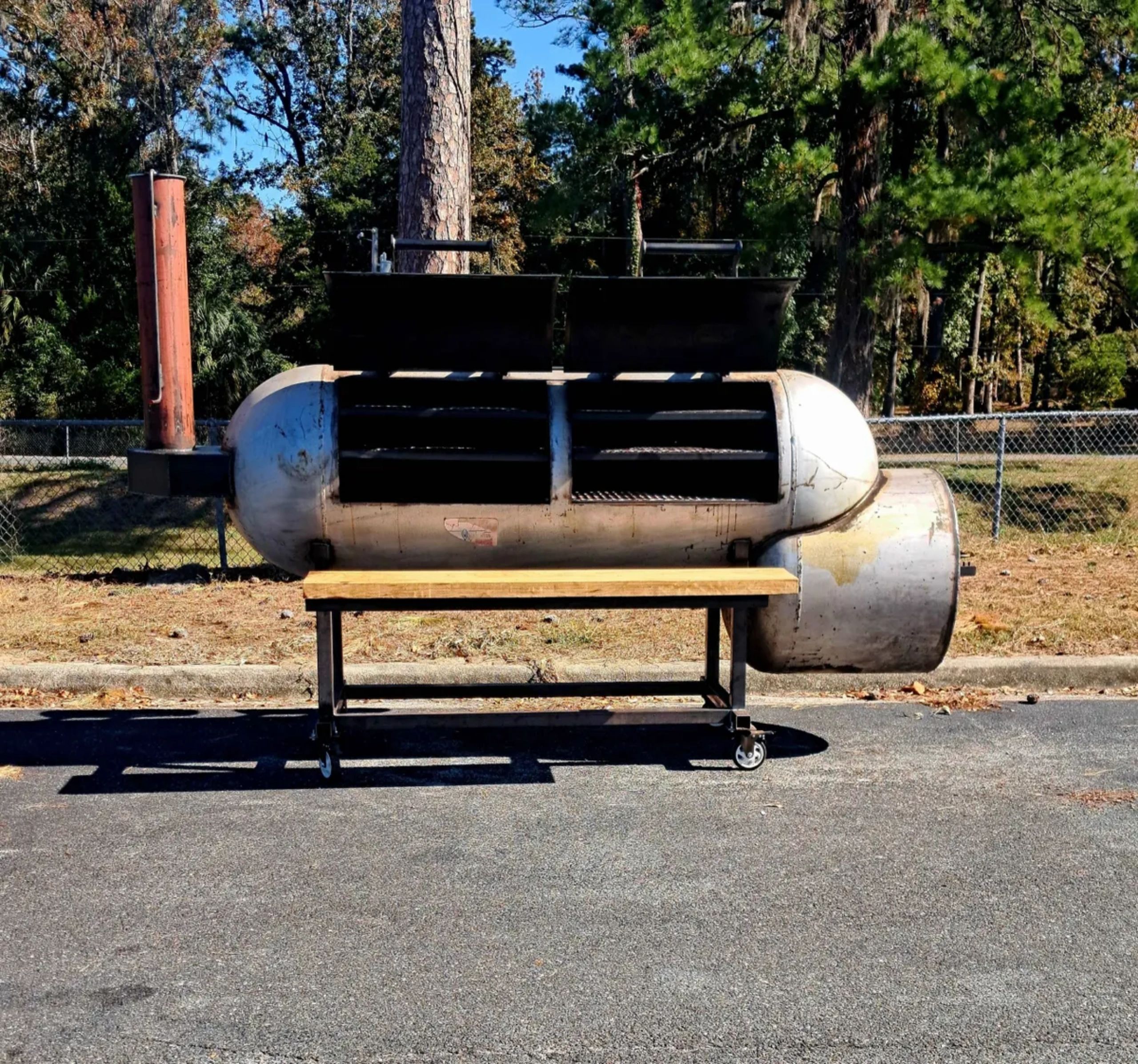 The steel creature your wife told you not to buy. This monster can cook enough meat to feed your family, your neighbors, and everyone who pretends they don't smell what you're cooking. Rolls on casters. Built like a tank. Eats logs for breakfast.